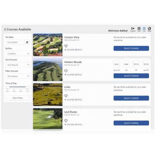Enable guests, members, and lodging guests to book tee times online with ease, featuring real-time scheduling for all player types and seamless integration with lodging reservations.